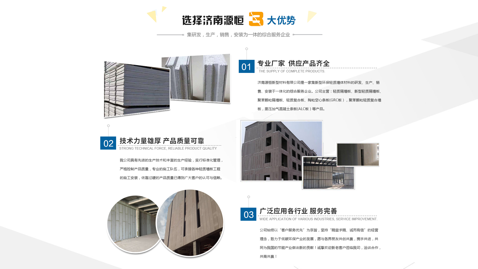 濟南源恒新型材料有限公司坐落于美麗的泉城濟南,是集新型環(huán)保輕質(zhì)墻體材料的研發(fā)、生產(chǎn)、銷售、安裝于一體化的綜合服務(wù)企業(yè)。我公司具有的生產(chǎn)技術(shù)和豐富的生產(chǎn)經(jīng)驗,為您提供輕質(zhì)隔墻板、新型輕質(zhì)隔墻板、聚苯顆粒隔墻板、輕質(zhì)復(fù)合板、陶粒空心條板(GRC板),聚苯顆粒輕質(zhì)復(fù)合墻板,蒸壓加氣混凝土條板(ALC板)等產(chǎn)品,本公司有專的施工隊伍,可承接各種輕質(zhì)墻板工程的施工安裝。輕質(zhì)隔墻板是國家推廣使用的新型輕質(zhì)、綠色無害建材,是墻改節(jié)能政策大力扶持的環(huán)保節(jié)能產(chǎn)品,是發(fā)達國家普遍采用的新型墻體材料。濟南源恒新型材料有限公司實行標(biāo)準(zhǔn)化管理,嚴格控制產(chǎn)品質(zhì)量,依靠過硬的產(chǎn)品質(zhì)量已得到廣大客戶的認可與信賴。公司產(chǎn)品遍布各大城市,與國內(nèi)多家客戶建立了良好的合作關(guān)系。公司始終以“客戶服務(wù)優(yōu)先”為宗旨,堅持“精益求精、誠而有信”的經(jīng)營理念,致力于低碳環(huán)保產(chǎn)業(yè)的發(fā)展,愿與各界朋友共創(chuàng)共贏,攜手共進,共同為我國的節(jié)能產(chǎn)業(yè)做出新的...